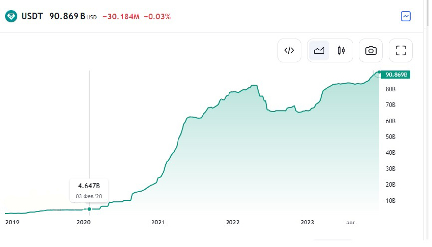 Возьмем к примеру наиболее популярный стейблкоин Tether USDT, капитализация сегодня которого составляет 91 миллиард долларов США, в то время как при той же стоимости в один доллар четыре года назад данный показатель был равен 4,6 миллиарда.